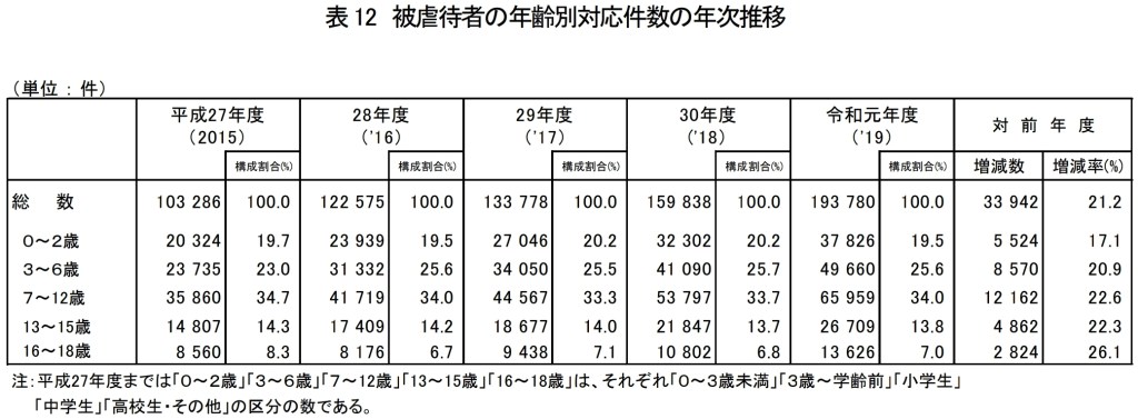 被虐待者は、7〜12歳、3〜6歳、0〜2歳の順に構成割合が多いです。