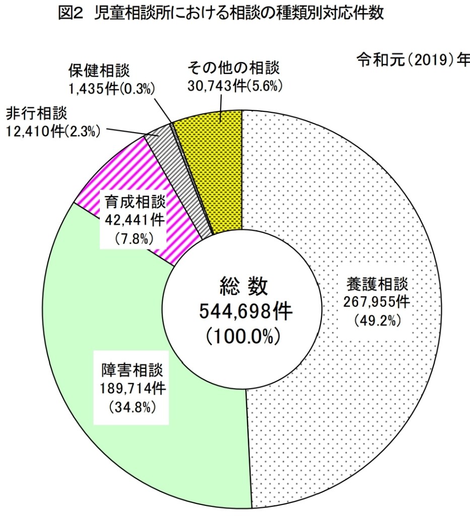 児童相談所における種類別対応件数で最も多いのは、養護相談です(全国54万件中半分の27万件)。