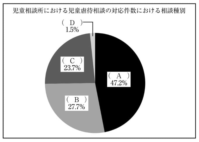 次の図は、「平成27年度福祉行政報告例」において報告された、児童相談所における児童虐待相談の相談種別の割合を示したものである。( A )~( D )にあてはまる語句を【語群】から選択した場合の正しい組み合わせを一つ選びなさい。