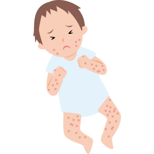 水痘は、軽い発熱とともに発しんが表れ、最初は小紅斑で、やがて丘疹となり水疱ができます。