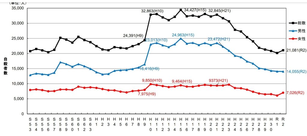 年間の自殺者数は、平成15年に最多の3万4427人を記録してから、平成24年に3万人を割り、以降前年より減少傾向です。