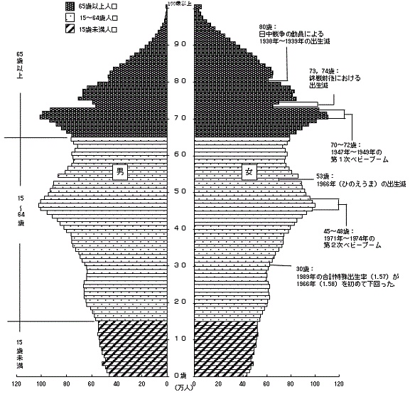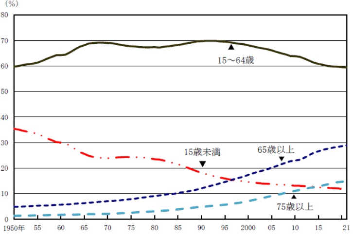 - 15~64歳 (生産人口)は過去最低(6割弱)