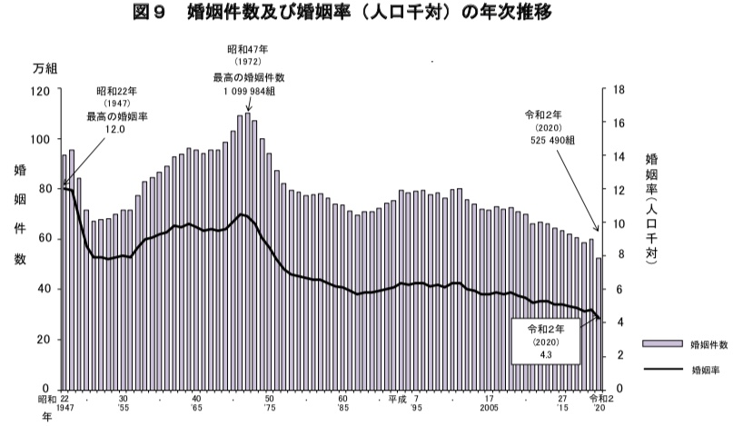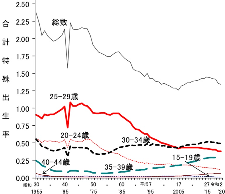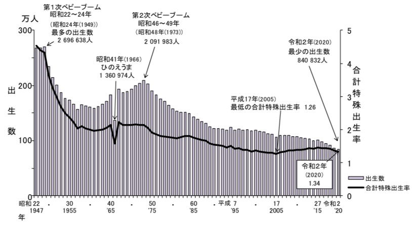 - 令和2年(2020)合計特殊出生率1.34 で前年より低下