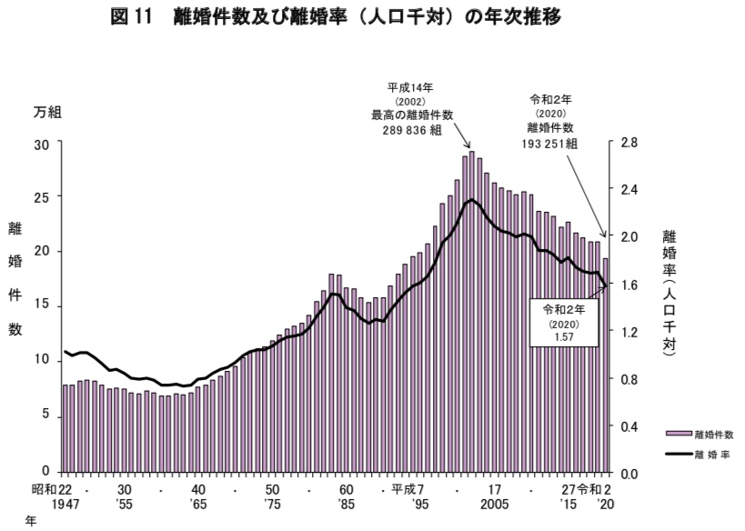 - 離婚率は、2002(平成14)年に最も高くなり、その後は概ね減少傾向にあります。