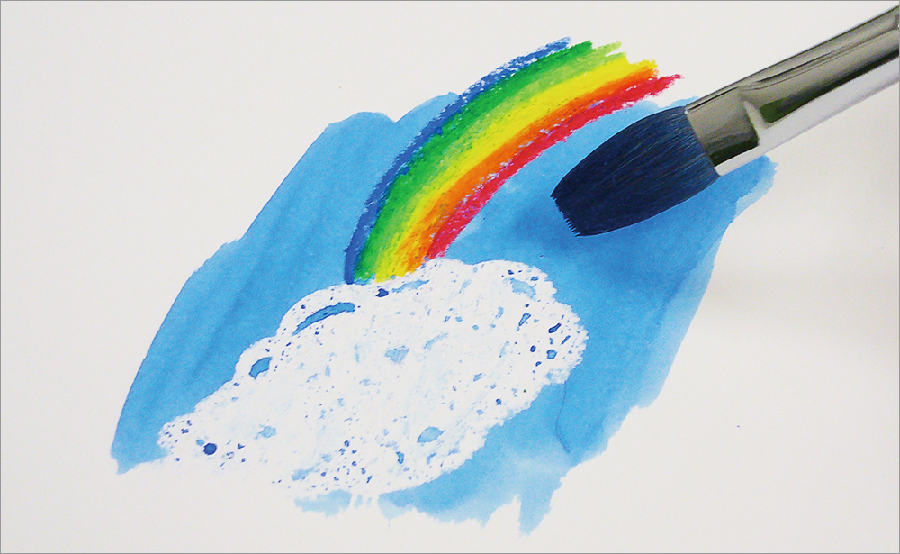 画用紙にクレヨンや油性絵の具、ロウなどで描いた上に、大目の水で溶いた水彩絵の具を置き、水分をはじいた色合いや効果を得る絵画技法のことです。