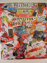 コラージュは、新聞の切り抜き、壁紙、書類、雑多な物体などを貼り合わせる技法です。