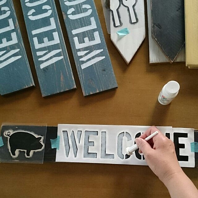 ステンシルは、文字や絵柄などの型板を転写してできる技法です。
