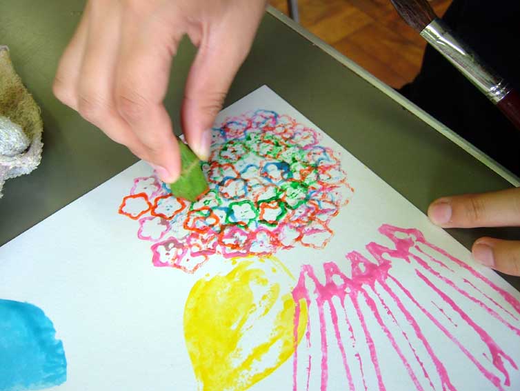スタンピングは、凹凸のあるものや、絵の具をつけて型取りができるものに絵の具をつけてスタンプし、型の模様を表す絵画技法です。