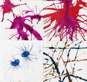 また、ポタリと落ちた絵の具をストローなどで吹き流し、多様な軌跡を描いたりします。