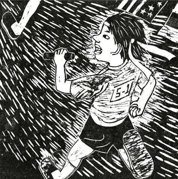 N : そうですね。版画の種類には凸版、凹版、孔版、平版があります。紙を貼り重ね、その上にインクをつけて刷る紙版画は( B 凸 )版です。