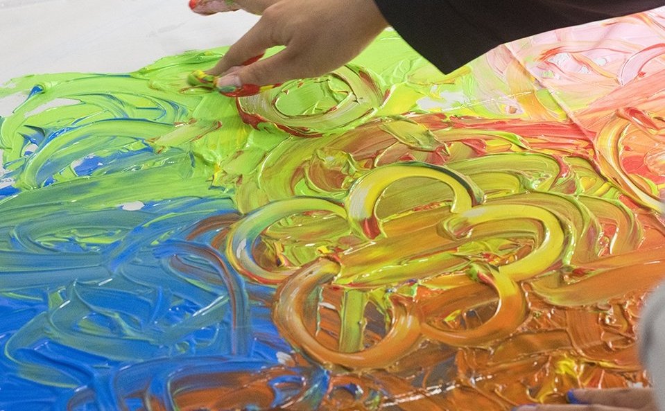 ドリッピングは、水を多く含んだ絵の具を絵筆に染み込ませ、直接画用紙に絵筆で描くことをせず、絵筆から絵の具をポタリとしたたらせて描く技法です。