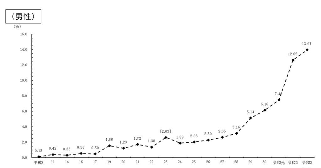 - 「平成29年度 雇用均等基本調査」によると、男性の育児休業取得率は平成29年度は5.14%です。→約7%