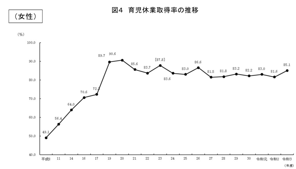 在職中に出産した女性のうち育児休業を開始した者の割合は約9割です。