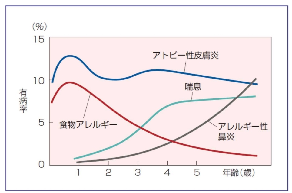 × D アレルギー体質の子どもは、年齢によって様々な症状を起こすが、最初に起こりやすい症状はぜんそくである。