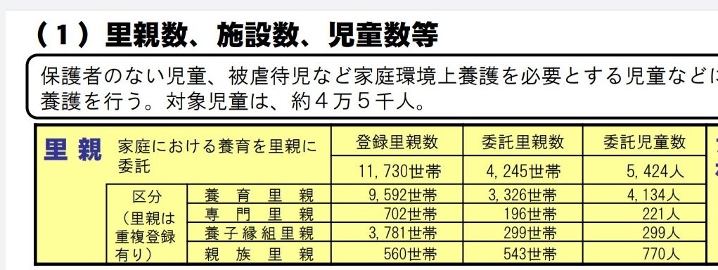 - 保護者のない児童、被虐待児など家庭環境上養護を必要とする児童は約4万5千人いると言われています。そのうち、里親及びファミリーホームに委託されている児童は約6千人で、全体の半数には達していません。→7千人