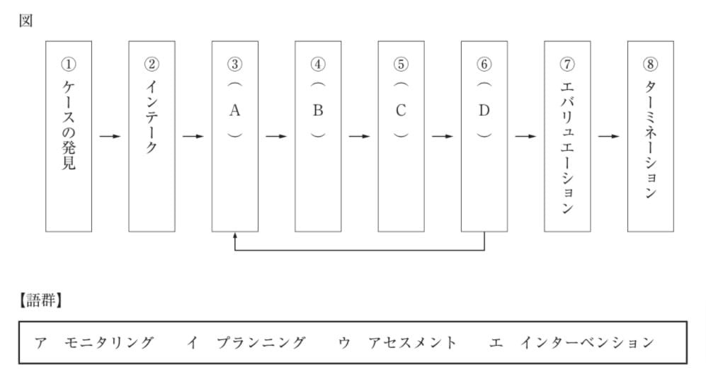 次の図は、ソーシャルワークの展開過程を示したものである。( A )~( D )にあてはまる語句を【語群】から選択した場合の正しい組み合わせを一つ選びなさい。