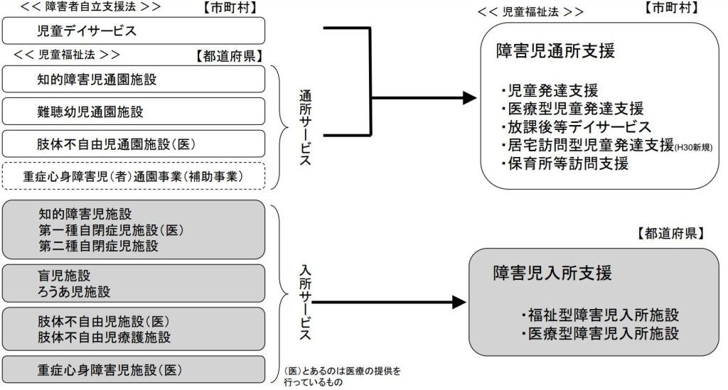 平成24年4月施行「児童福祉法」の改正では、通所、入所別に一元化されました。