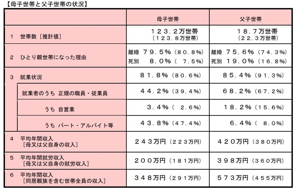 - 平均年間年収は、父子世帯380万円で、母子世帯は223万円です。そのため、100万円以上の差がありほとんど差が無いとはいえないため誤りです。