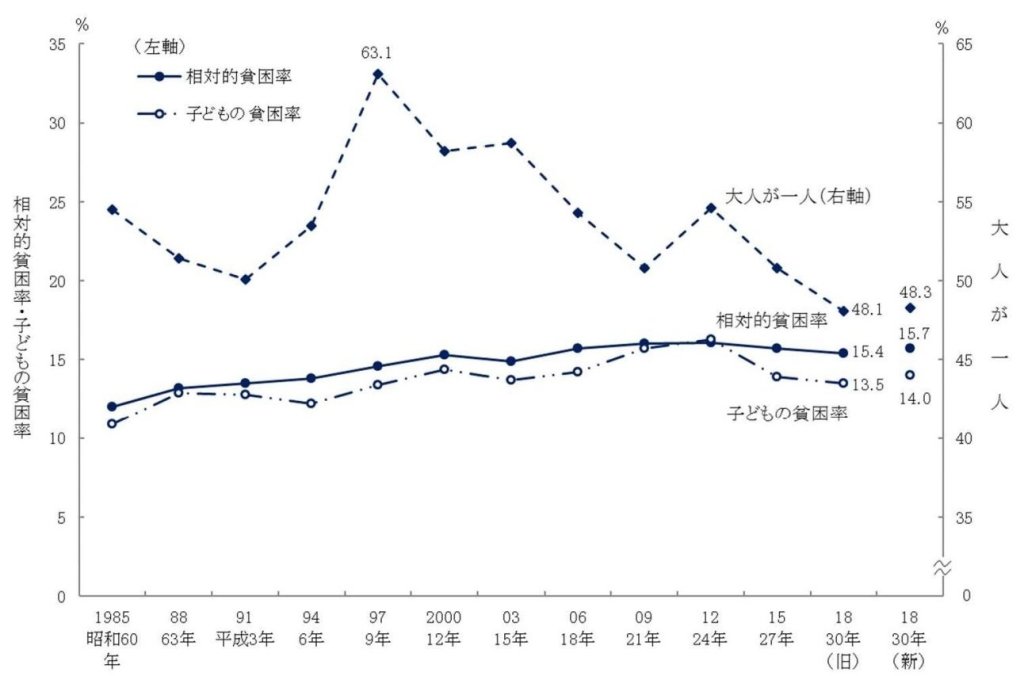 - 子供がいる現役世帯のうち大人が一人の場合の相対的貧困率は54.6%です。