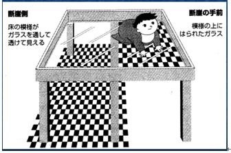 断崖があるように見える実験装置で、乳幼児が奥行を知覚できるか明らかにするために開発された。その後、他の研究者によって、乳幼児がなじみのない場面に出会い、どのように振舞ってよいか分からないときに、他者の表情や態度を参考にする社会的参照を確かめる装置としても用いられた。