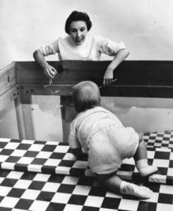視覚的断崖の装置の向こうにいる母親に、1歳の子どもに対して手招きをします。