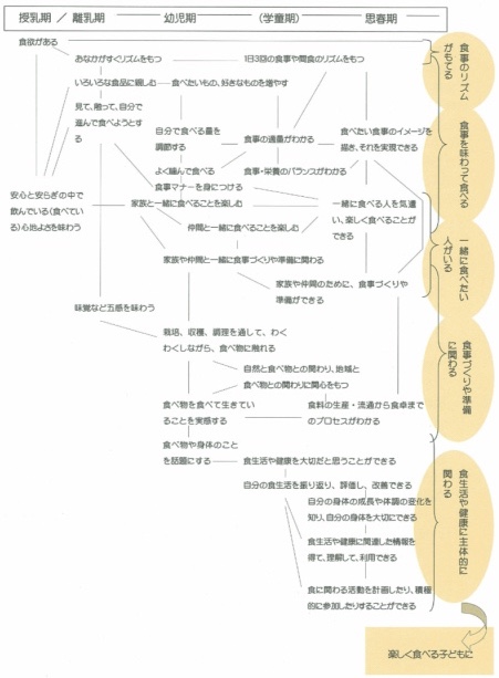 - 学童期以降は、さまざまな学習を通して、栄養バランスや食材から調理、食卓までのプ ロセスなど食に関する幅広い知識を習得し、理解を深めていきます。 自分の周りに数多く存在する食べ物や食に関する情報から、 自分にふさわしいものを自分で選んで生活していくことが必要にな ってきます。