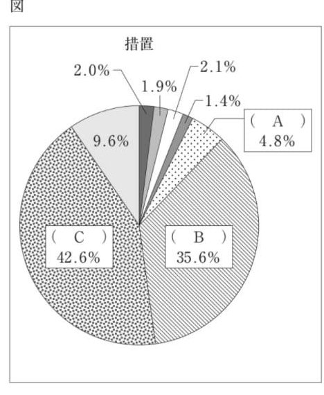 次の図は、「厚生労働省社会・援護局障害保健福祉部障害福祉課障害児・発達障害者支援室調べ(平成31年1月17日時点)」において報告された、福祉型障害児入所施設における措置、及び契約による入所理由である。( A )~( C )にあてはまる語句を【語群】から選択した場合の正しい組み合わせを一つ選びなさい。